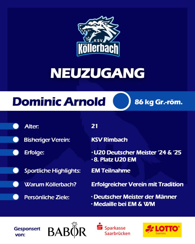 Der 21-jährige Athlet wechselt vom KSV Rimbach ins blau-weiße Lager der „Wölfe“ nach Köllerbach. Trotz seines jungen Alters kann Arnold bereits beachtliche Erfolge vorweisen: