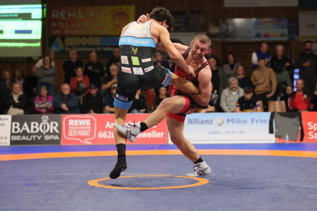 Der Mannschaftskampf begann mit mehreren Begegnungen, in denen sich die Gäste früh Vorteile sichern konnten. Nico Hauch unterlag im griechisch-römischen Stil durch Schultersieg. Im Schwergewicht zeigte Oleksandr Khotsianivskyi über die volle Kampfzeit eine engagierte Leistung, musste sich jedoch nach Punkten geschlagen geben. Auch Valentin Seimetz hielt den Kampf offen, verlor aber knapp. In den weiteren Kämpfen vor der Pause setzte sich Schorndorf mehrfach deutlich durch und führte zur Pause mit 16:0.