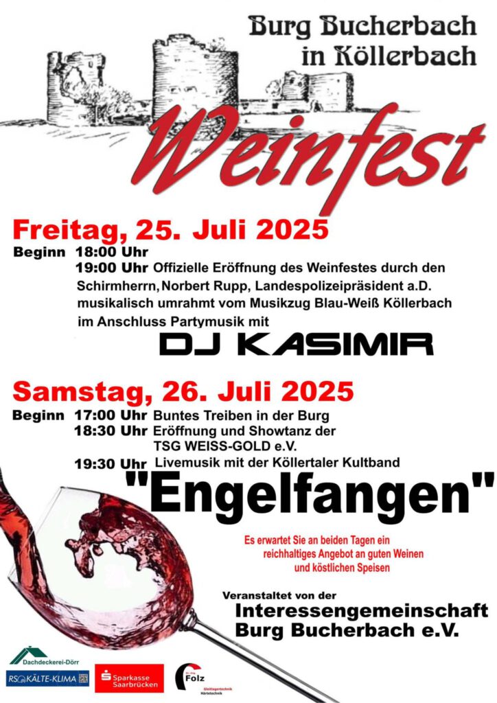 Am 25. und 26. Juli ist es wieder soweit: Das beliebte Weinfest in der Burg Bucherbach öffnet seine Tore und der KSV Köllerbach ist natürlich auch in diesem Jahr mit seinem wunderbaren Stand vertreten!